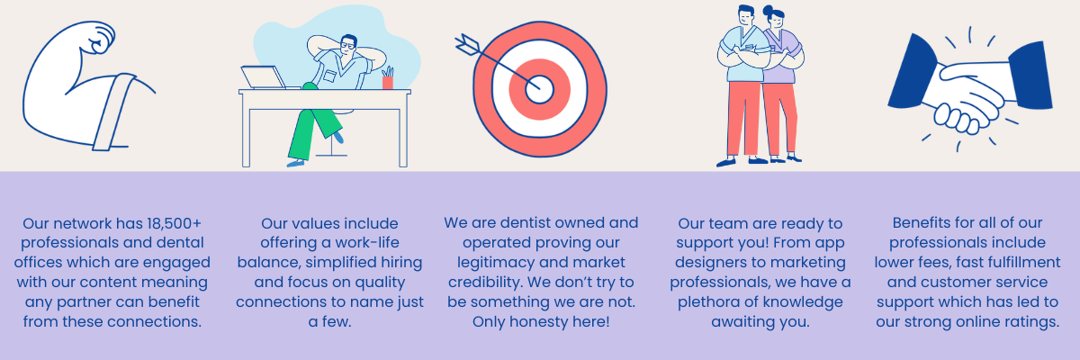 Our partnership program for education is intended to further the work we do to bring accurate information to the dental industry. We also love working with grads and believe temping is a great way to start a new career. During this program, we hope to collaborate on meaningful content, events and messaging that can benefit both of our engaged audiences. This will also be ideal for reaching out to the wider dental industry to help shape meaningful change.